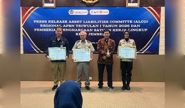 Dalam kegiatan press release Aset Liabilities Committee (ALCo) Regional APBN Triwulan I Tahun 2026, satuan kerja Polres Jember berhasil meraih tiga penghargaan sekaligus dari Kantor Pelayanan Perbendaharaan Negara (KPPN) Jember, Selasa, (14/4/2026)