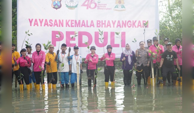 Yayasan Kemala Bhayangkari (YKB) Cabang Polres Pelabuhan Tanjung Perak melakukan aksi nyata pemulihan lahan kritis dengan menanam ratusan bibit pohon mangrove dan bakau di kawasan tersebut, Rabu (22/4/2026) pagi.